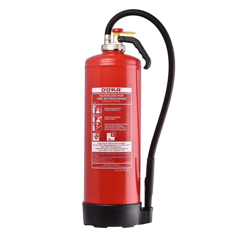 The DÖKA fire extinguishers from the Pi-36 series are rechargeable fire extinguishers with an internal CO2 propellant gas cartridge. Their specialty lies in the extinguishing powder used. These fire extinguishers are filled with BC extinguishing powder, which is electrically non-conductive. This means that these devices can be used in live high-voltage systems (observe national safety regulations).